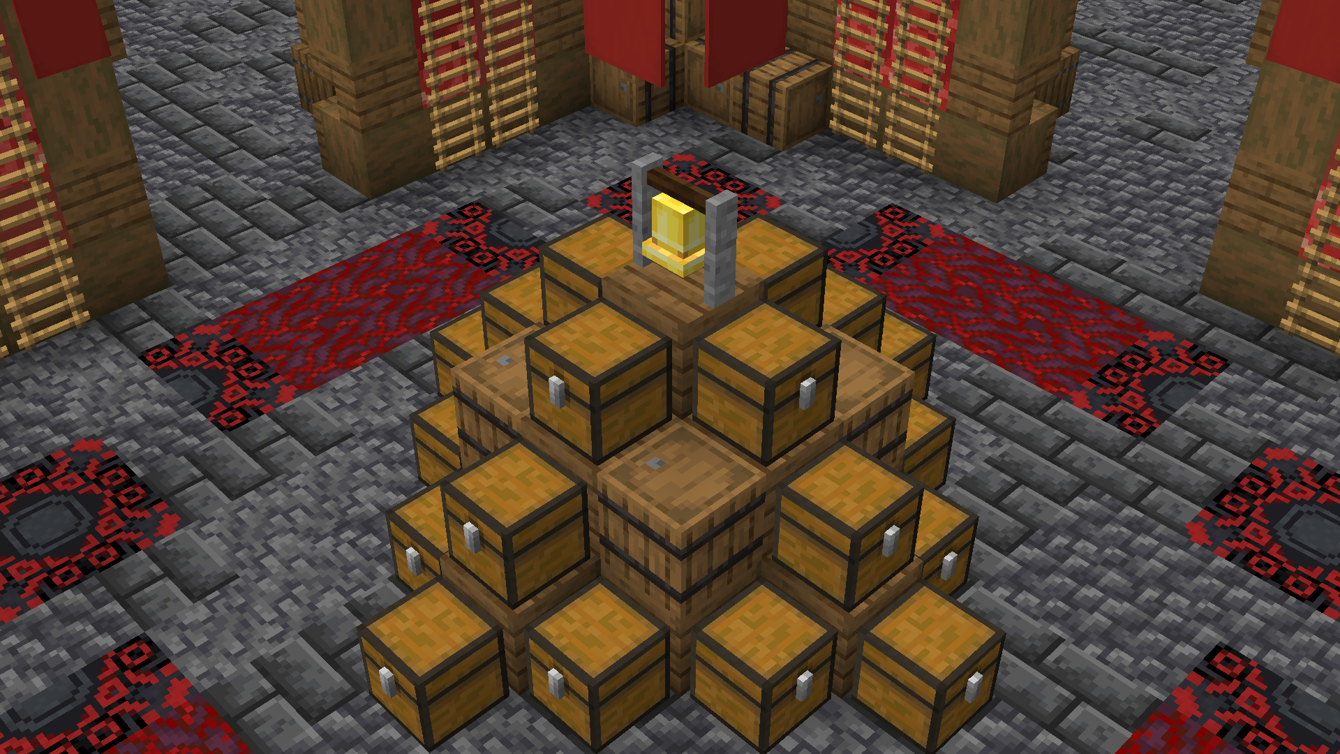 A Japanese Structure filled with barrels and chests.
